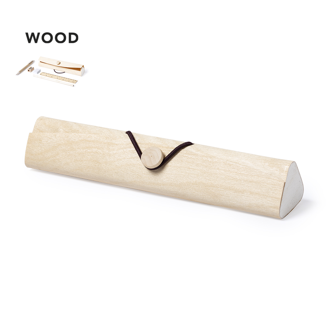 Θήκη Nature line από ξύλο, με ελαστικό λουρί κλεισίματος. Περιλαμβάνονται 5 αξεσουάρ: 1 x στυλό με κουμπιά από ανακυκλωμένο χαρτόνι, με αξεσουάρ από άχυρο σίτου και μπλε μελάνι. Χαρακτηριστικό καλαμάκι σίτου στο επάνω μέρος του στυλό. 1 x ξύλινο μολύβι μήκους 177 mm x διάμετρος 7 mm (μη ακονισμένη μύτη) 1 x 15cm/6inch ξύλινος χάρακας 1 x ξύλινη ξύλινη ξύστρα 1 x λευκό καουτσούκ.