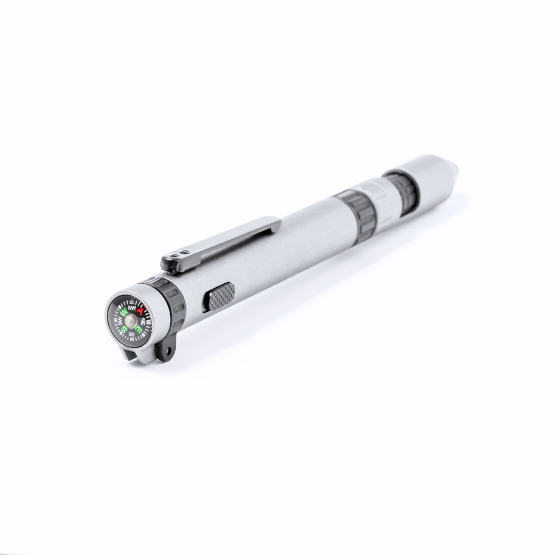 Πρακτικό στυλό πολλαπλών χρήσεων με 7 χρήσεις. Περιλαμβάνει: θήκη κινητού τηλεφώνου, γραφίδα, στυλό με μπλε μελάνι, φακό που λειτουργεί με μπαταρία κυψέλης (περιλαμβάνεται), πυξίδα, κατσαβίδι επίπεδο και φιλιπς. Παρουσιάζεται ξεχωριστά σε κουτί με σχέδιο κραφτ.