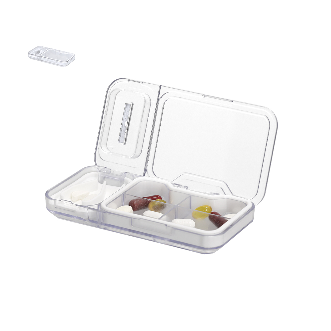 Θήκη οργάνωσης χαπιών με 4 εσωτερικά διαμερίσματα, κλείσιμο ασφαλείας με άκρες σιλικόνης και κόφτη για διαχωρισμό χαπιών. Κατασκευασμένο με διαφανές φινίρισμα.