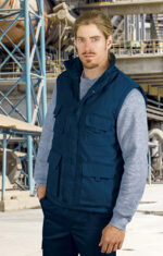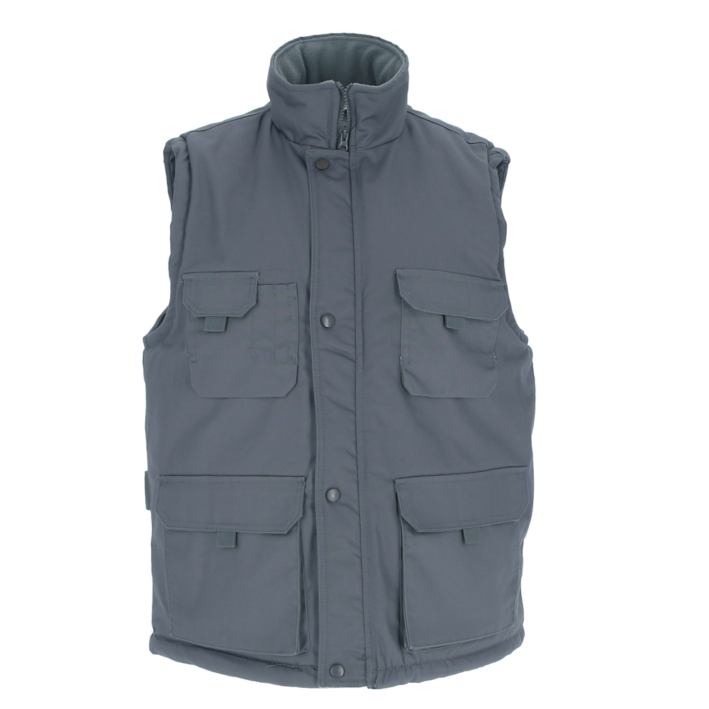 Γιλέκο εργασίας με πολλές τσέπες και επένδυση από φλις. Κατασκευασμένο από εξωτερικό ύφασμα που απωθεί το νερό από καμβά, εσωτερική επένδυση με καπιτονέ ύφασμα και αντιπυρική επένδυση από φλις που παρέχει εξαιρετική θερμομόνωση. Όρθιος γιακάς με φερμουάρ σε όλο το μήκος και κλείσιμο με ασορτί κουμπί μπροστά, για ζεστασιά και άνεση.