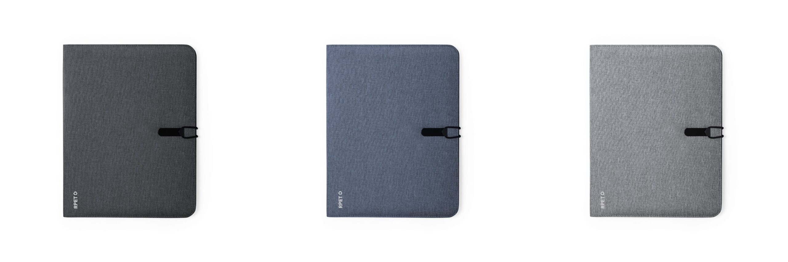 Κομψός φάκελος A4. Κατασκευασμένος από ανθεκτικό 600D RPET από ανακυκλωμένο πλαστικό για να ενθαρρύνει την επαναχρησιμοποίηση των πλαστικών αποβλήτων και να συμβάλλει στην αειφορία του πλανήτη. Λεπτομέρειες σε μαύρο χρώμα. Συμπεριλαμβάνεται ελαστική ζώνη, μεταλλικό κλείσιμο σχεδιασμένο για εκτύπωση με λέιζερ. Εσωτερικά με αποσπώμενο σημειωματάριο 20 σελίδων σε ριγέ διάταξη, 3 τσέπες με πτερύγια, θήκες για κάρτες και θήκη για στυλό. RPET διακριτικό στη γωνία.