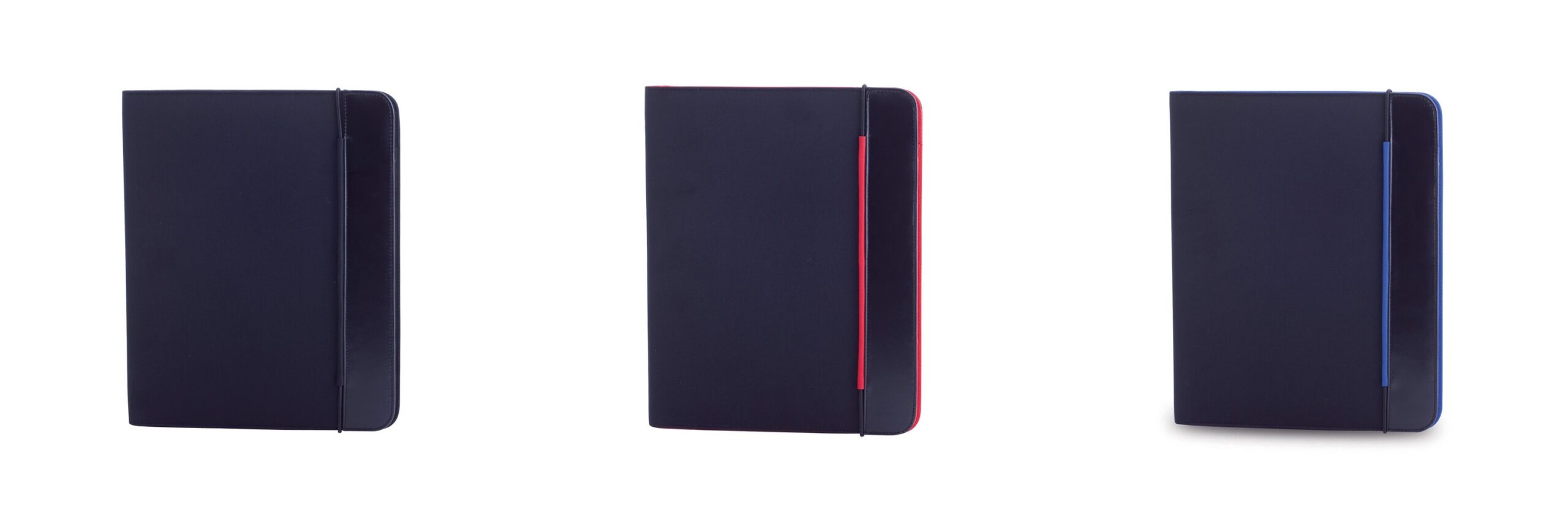 Φάκελος με δίχρωμο σχέδιο σε φωτεινούς τόνους, από μαλακή μικροΐνα με κλείσιμο με ελαστική ταινία. Αντίστοιχο χρώμα στο εσωτερικό με σημειωματάριο 20 κενών φύλλων, τσέπη με πτερύγιο, θήκες για κάρτες και θήκη για στυλό.
